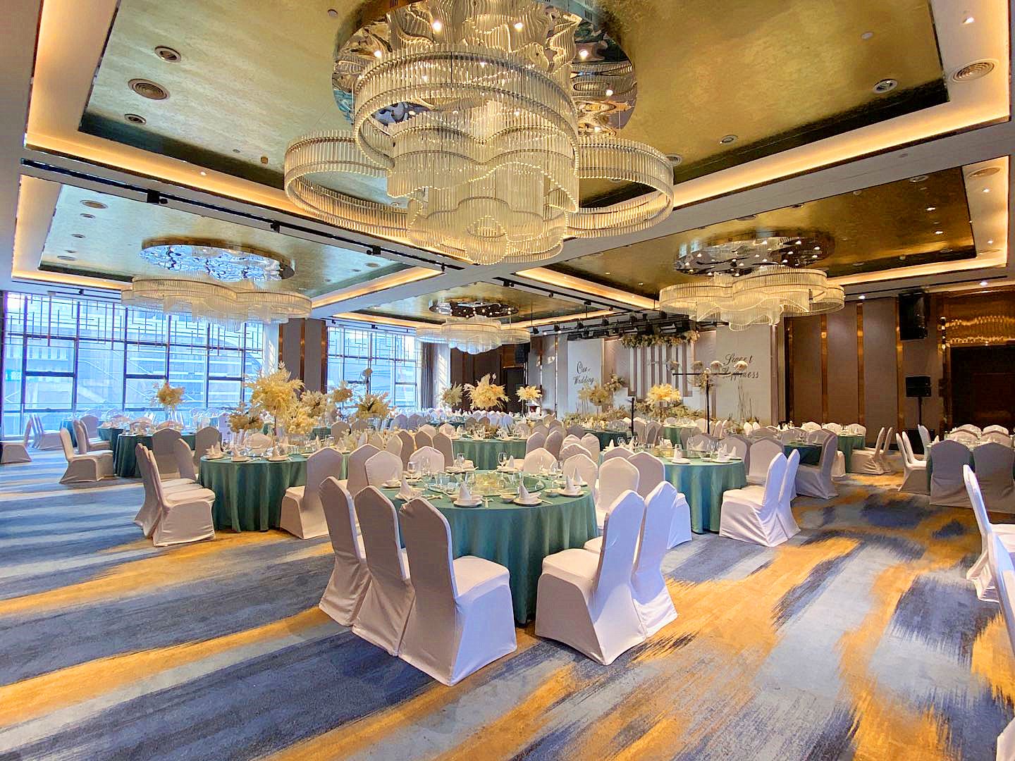 面积450平方米,5米挑高让大厅空间气派感一览无余,,豪华无柱通透设计,拥有独立、宽敞迎宾区,先进高端的灯光音响设备,32平米的LED显示屏,可满足各种宴会、会议、研讨会、酒会等不同活动的需求。