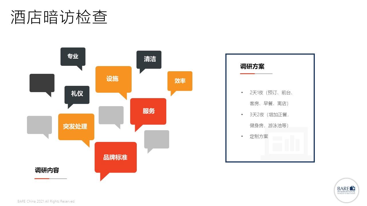 柏迩采用“神秘顾客”暗访检查的形式,对酒店宾客的体验进行调研,并根据调研结果为酒店业主和管理方提供可执行性分析报告和行动计划。