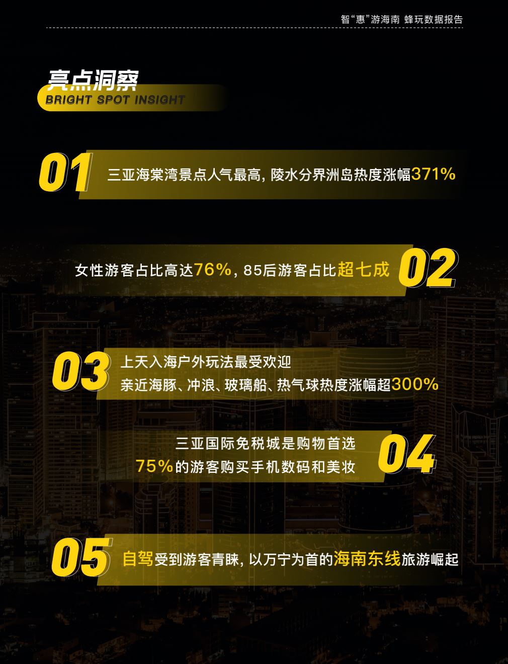 报告通过对2021年3-5月海南自由行市场的大数据分析,从海南目的地、海南游客画像、海南游客搜索三个方面的多个维度,并基于指数水平,解析了春季海南旅游市场的热点、爆点,以及自由行人群的行为偏好,并据此作出对海南自由行人群未来消费行为的洞察和预测,并为游客出行提供参考。